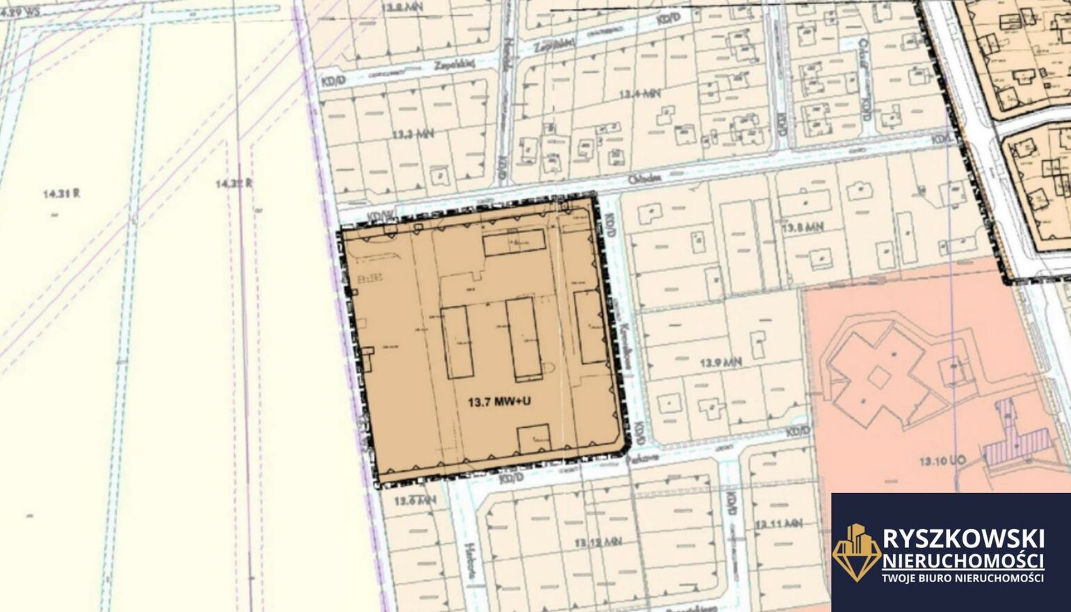 Działka przeznaczona jest według Miejscowego Planu Zagospodarowania Przestrzennego pod zabudowę mieszkaniową wielorodzinną z usługami ( 13.7 MW+U) z ograniczeniem wysokości zabudowy do 12,00 metrów.