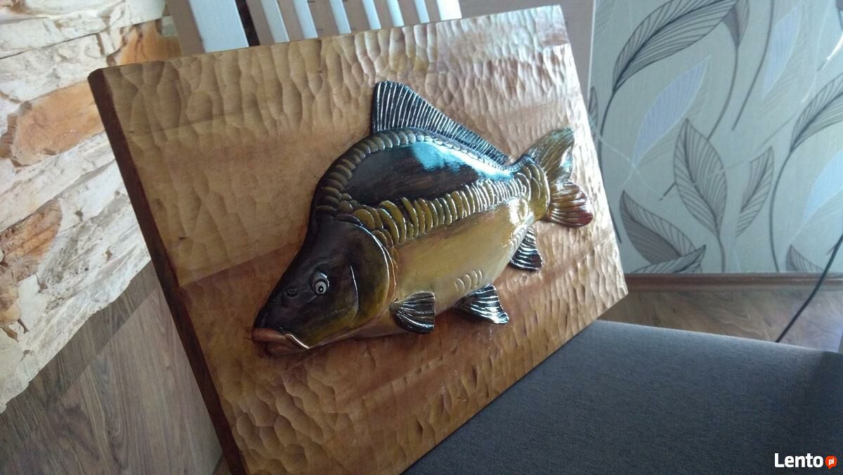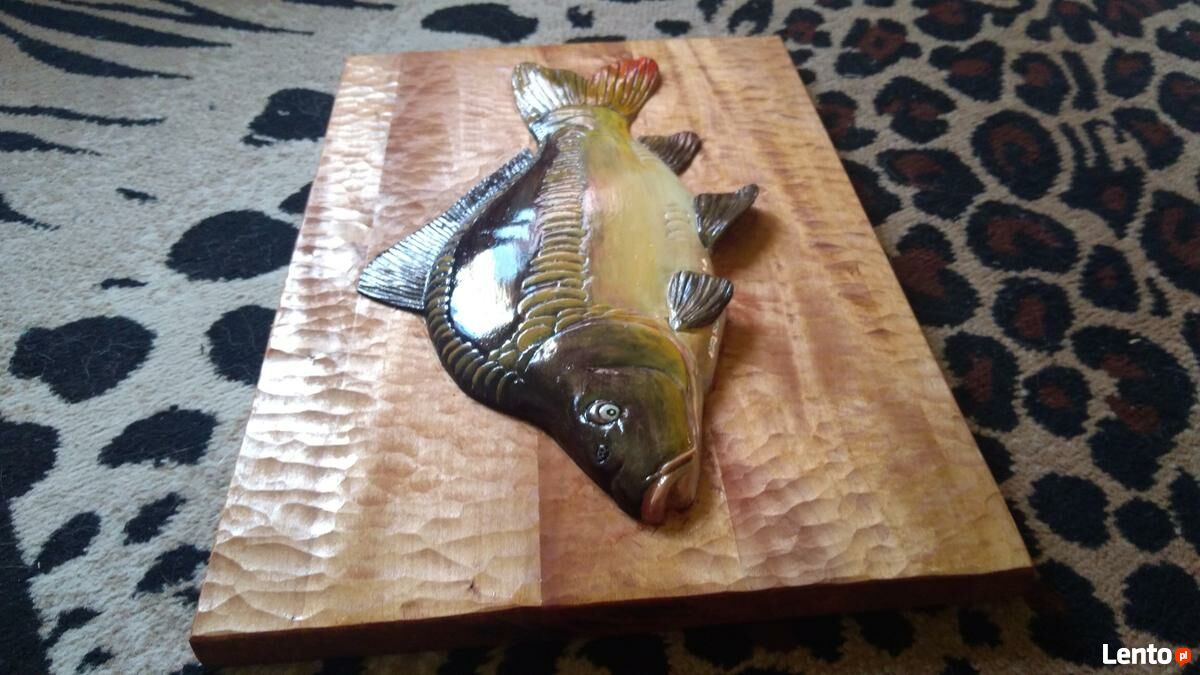 Wyrzezbiony przeze mnie karp z drewna lipowego.Praca jest sklejona (takie klejenie zapobiega krzywieniu) z kilku grubych desek.Karp wyrzezbiony ze wszystkimi szczegółami,wygląda jak zywy.Pomalowany jest farbami akrylowymi i zabezpieczony lakierem.Fajny pomysł na orginalny prezent.Czas realizacji ok.tygodnia dlatego ze to wszystko to ręczna praca.Wykonuje rzezby,płaskorzezby na zamówienieWymiary:szer:47cm