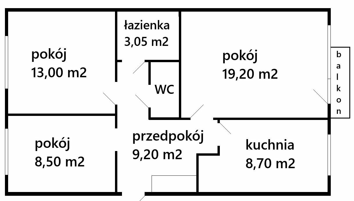 • 3 pokoje, kuchnia, przedpokój, łazienka, WC i balkon