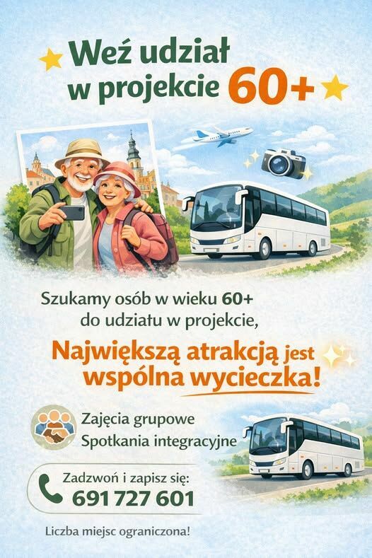 Zapraszamy osoby 60+ z terenu miasta Zamość do udziału w projekcie integracyjnym z trzydniową wycieczką.Zapraszamy do kontaktu 691 - pokaż numer telefonu -